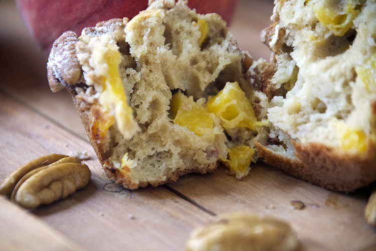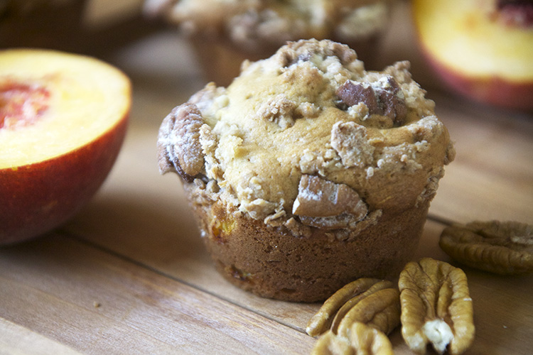 And that, my friends, is the idea behind this recipe. A nice, moist muffin absolutely filled with fresh baked peaches and topped with the most amazingly crunchy raw sugar and pecan topping ever. The body of the muffin is sweetened only with peaches and 100% pure grade B maple syrup. Now, that’s a recipe I can totally get behind. No “butts” about it (Haha, get it? Muffin butts? Right? Riiiiight?… )!