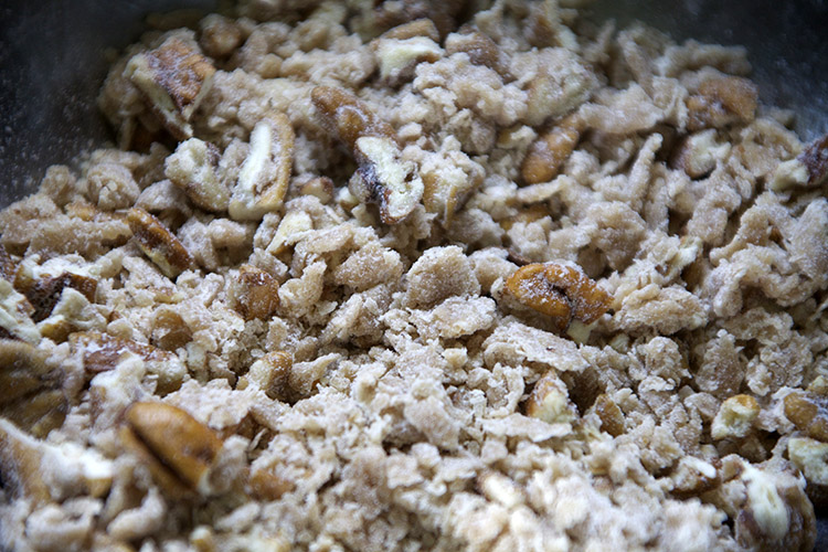 In a separate bowl, mix together reserved muffin batter and the remaining ingredients on the Crunchy Topping list by cutting them all together with a fork until small clumps form (see photo:)